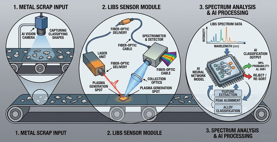 This is the pinnacle of 2026 recycling tech. A laser “zaps” a tiny spot on the metal, creating a plasma plume. The AI analyzes the light spectrum of that plasma to identify the exact chemical alloy (e.g., distinguishing 6061 aluminum from 7075 aluminum). This level of purity is what makes “Closed-Loop Recycling” possible.